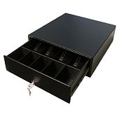 К средним компактным моделям ящиков для денег относят модели чуть большего размера, в которых предусмотрены 4-5 секций для купюр и 7-8 отделений для монет. Размер железных денежных ящиков для кассира зависит от конкретной модели. Так, ящик ШТРИХ-midiCD имеет длину 34 см, ширину 36 см и высоту 9,7 см. Денежный ящик АТОЛ EC-350 немного шире – 40 см, однако он тоже идеально подходит для ограниченного пространства и не создает неудобств кассиру.